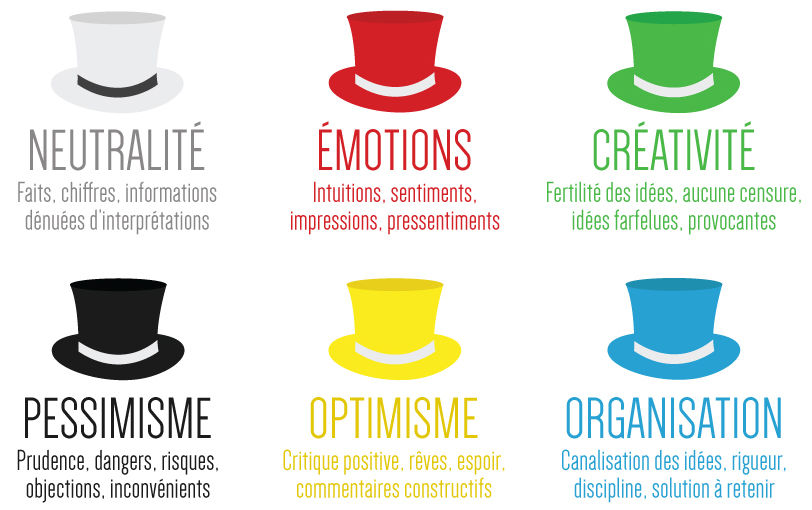 Les six chapeaux de Bono font partie aujourd’hui des méthodes classiques de résolution de problème, et parfois de créativité. Cette méthode est extraite de l’ouvrage « Six chapeaux pour penser ». C’est une méthode de management personnel ou de groupe, développée par Edward de Bono, permettant de traiter les problèmes dont une des conséquences est d’éviter la censure des idées nouvelles, dérangeantes, inhabituelles. Chaque participant prend un « chapeau » d’une couleur particulière, lui assignant ou lui reconnaissant un rôle. Ce chapeau peut changer durant la réunion. Il peut aussi être identique à celui d’autres participants.