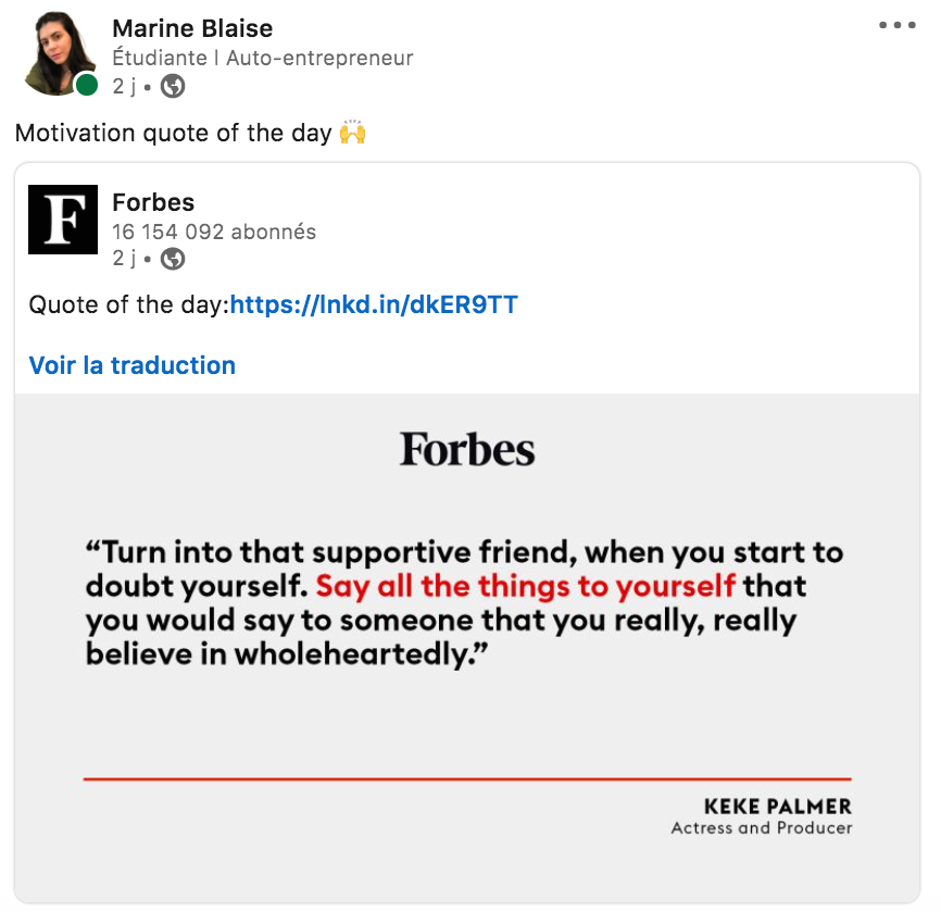 Voici par exemple une citation du magasine Forbes que j'avais posté sur mon mur LinkedIn :